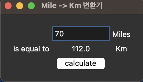 파이썬 기본 모듈인 tkinter 을 사용해서 miles -> km 변환기 만들기